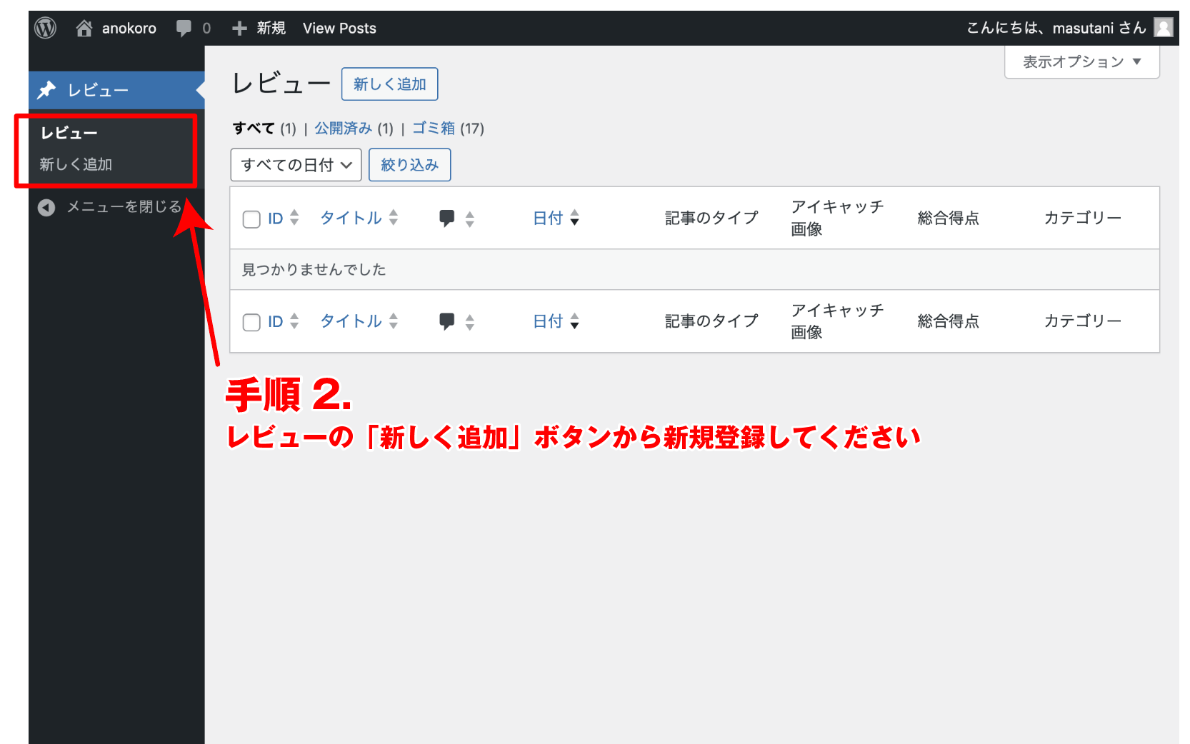 レビュー作成の管理画面が表示されます。メニィー左の「レビュー」から「新しく追加」をクリックしてください。