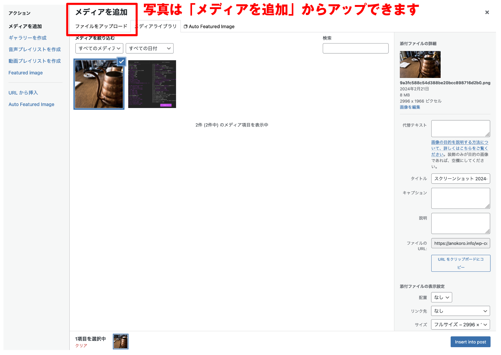 画像は「メディアを追加」ボタンからアップできます。